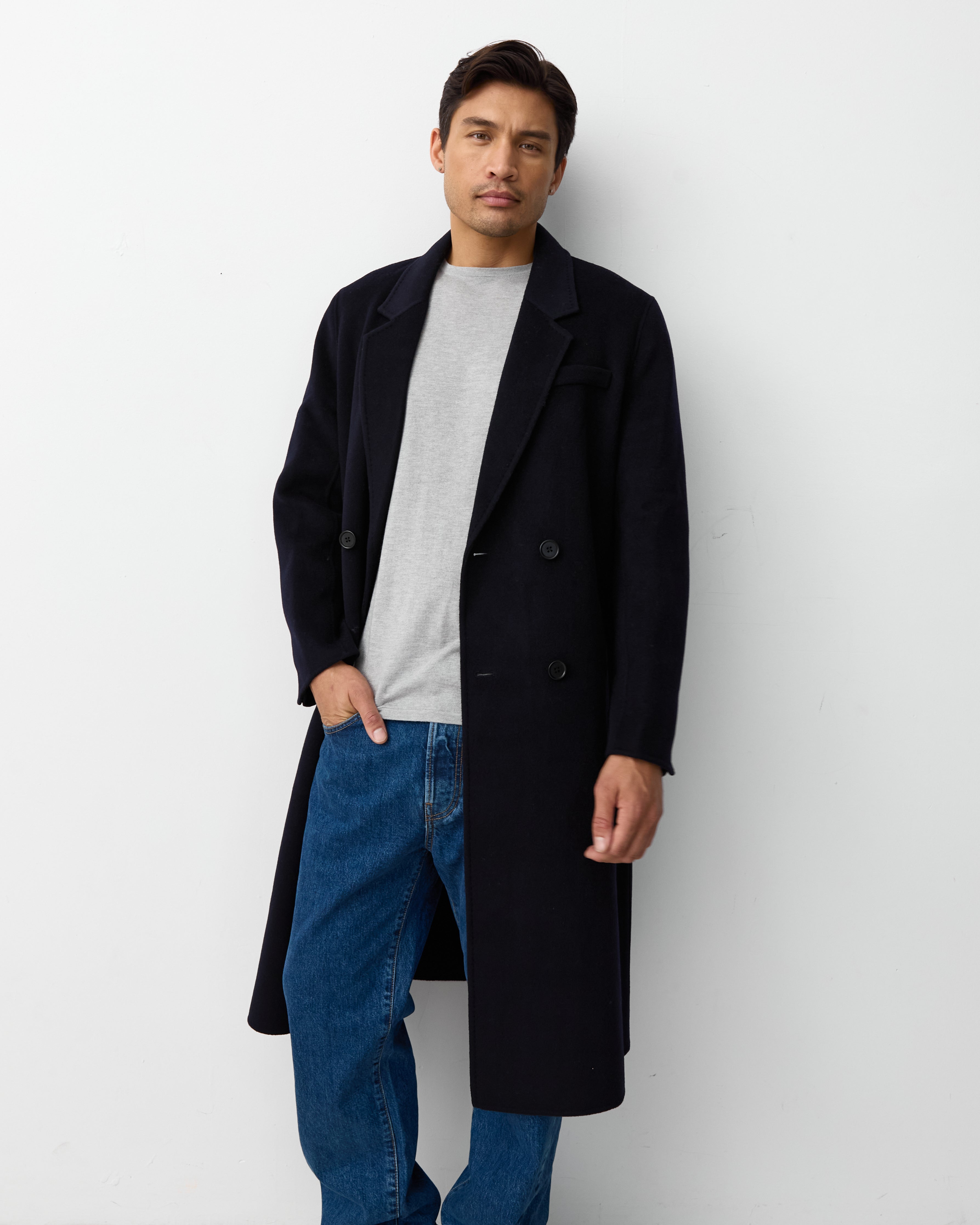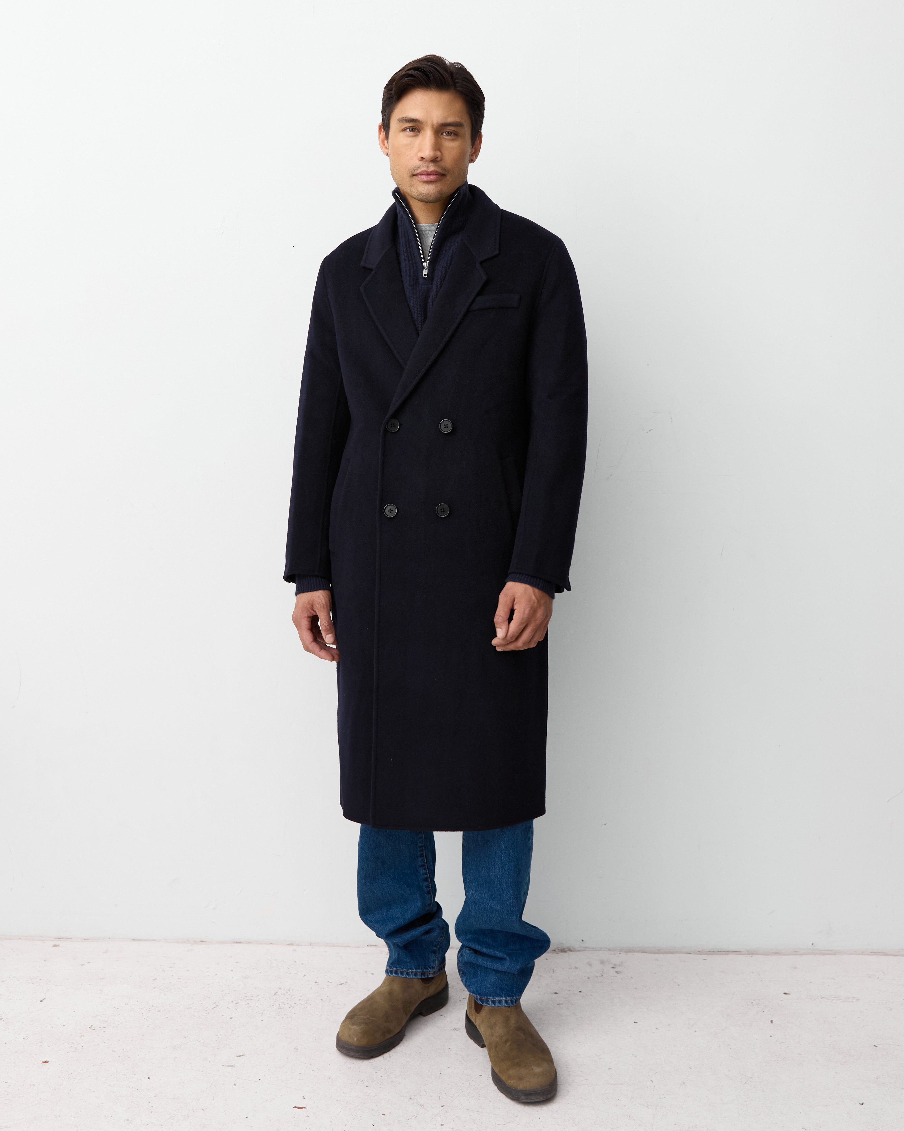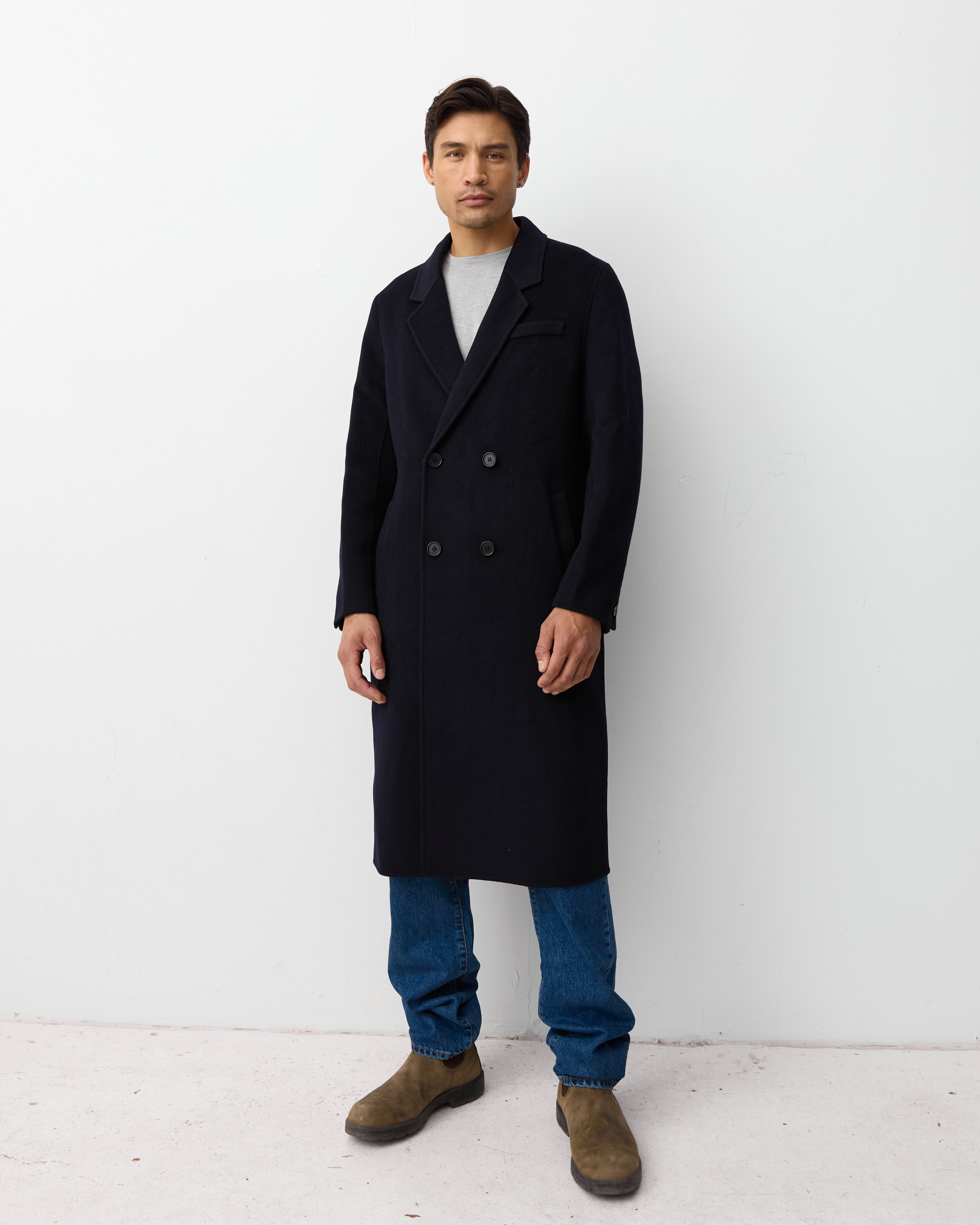 Discover our first coat curated for the other half. Made in our signature double faced cashmere merino wool blend and finished with a hand stitch. This is a double breasted coat created with a Scandinavian inspired relaxed fit.