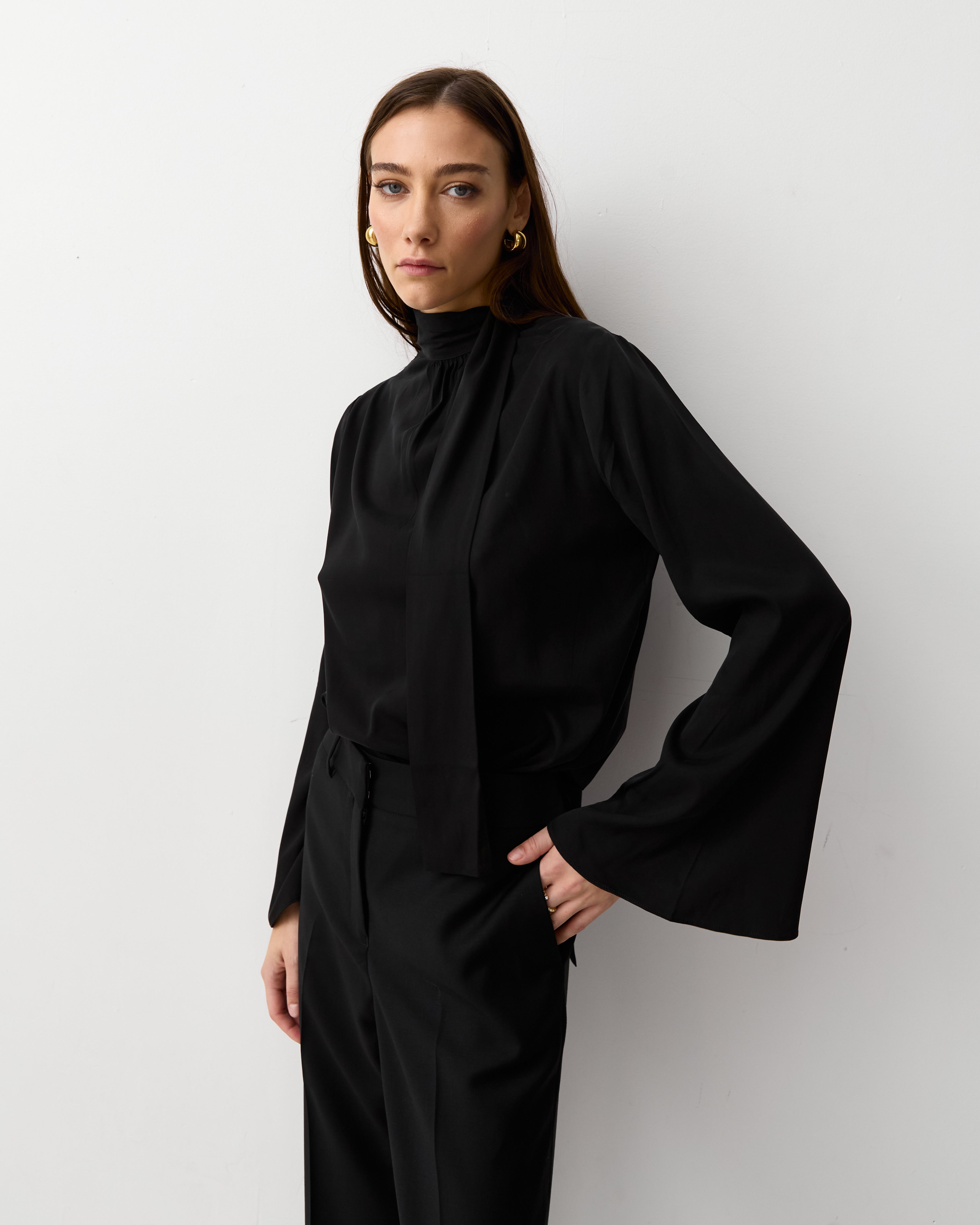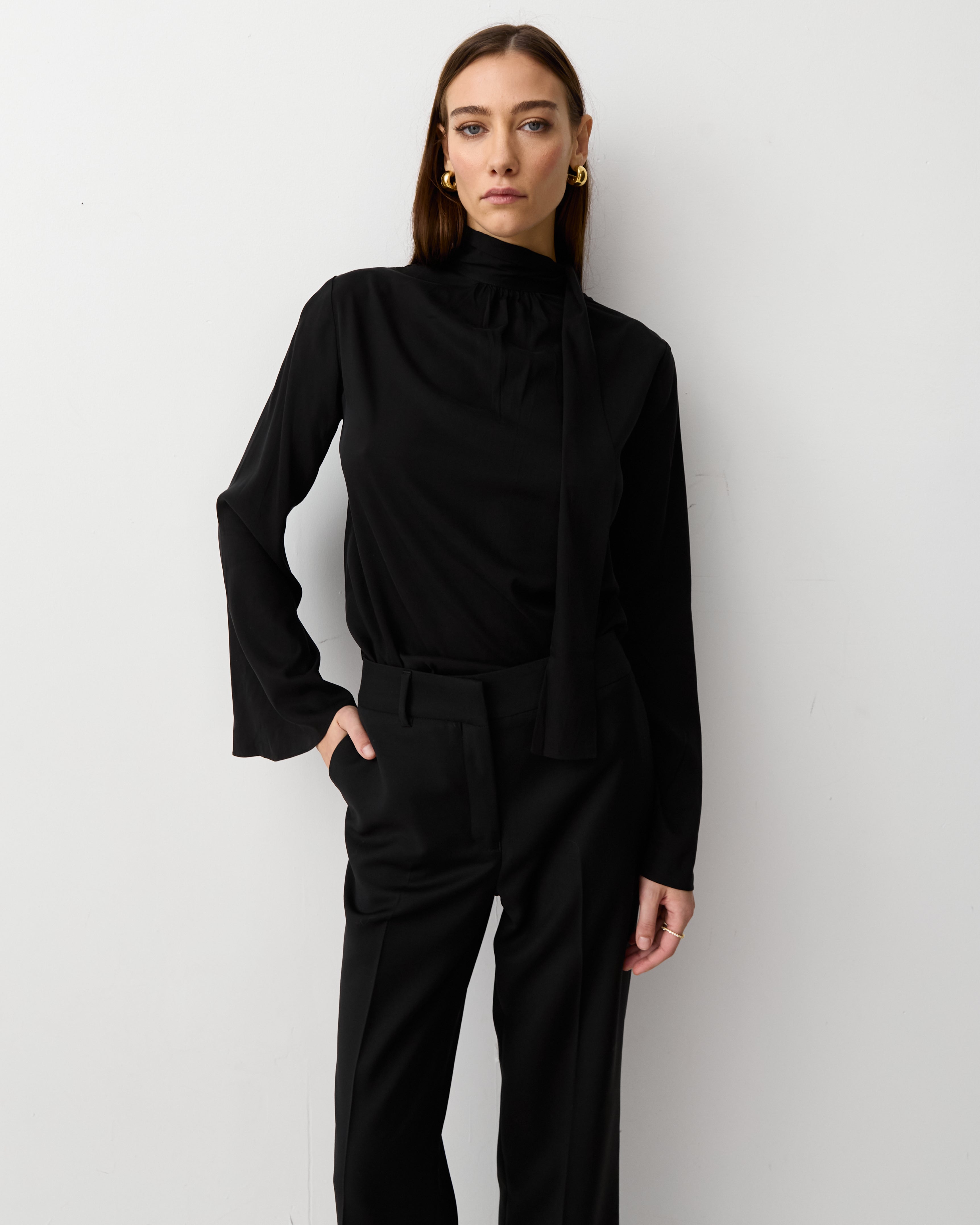 The blouse with scarf is a reinterpretation of sophisticated informality. It has a relaxed, fluid silhouette simply accented by the self-tie scarf detail, inviting various styling options.