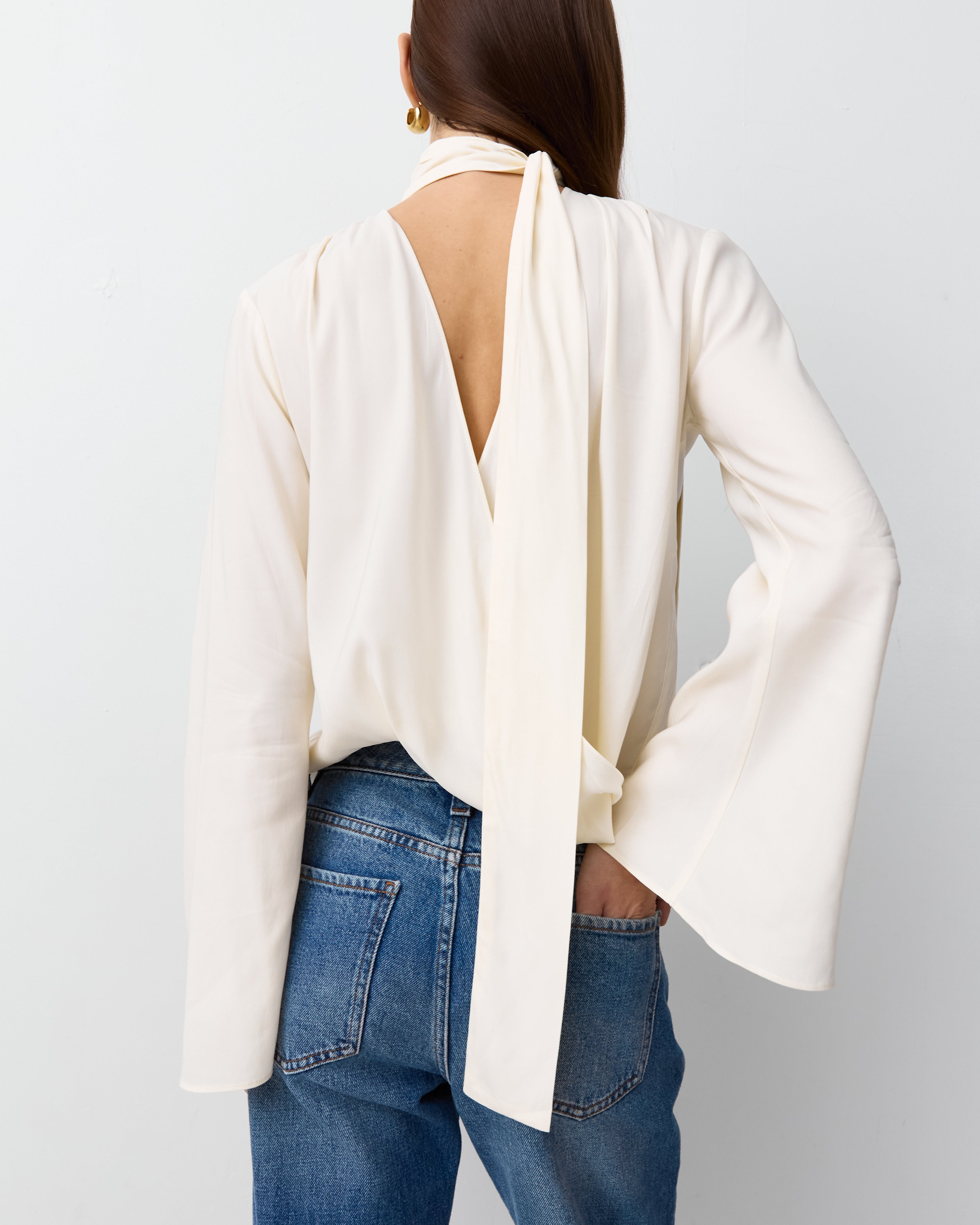 The Blouse with scarf is a reinterpretation of sophisticated informality. It has a relaxed, fluid silhouette simply accented by the self-tie scarf detail, inviting various styling options.