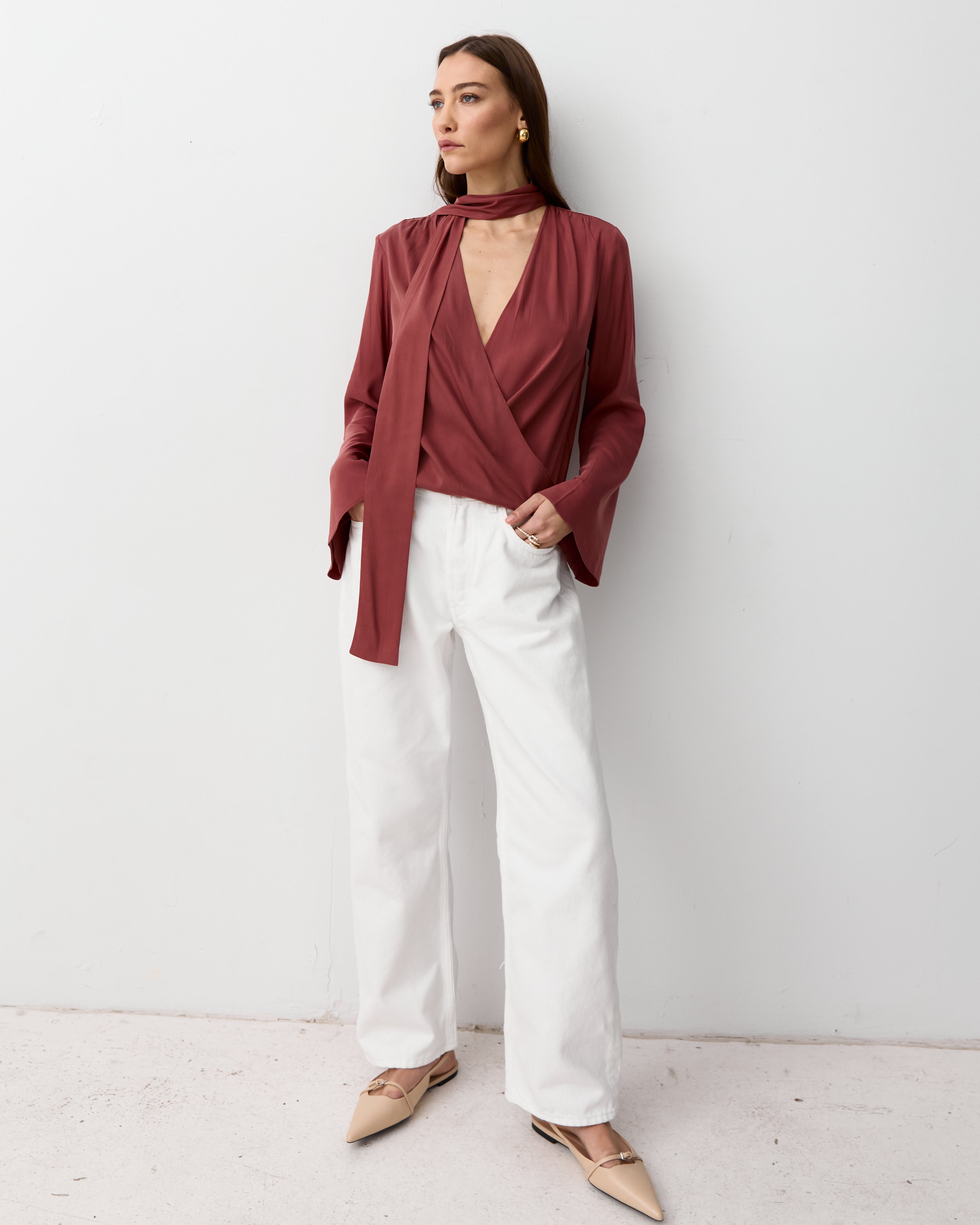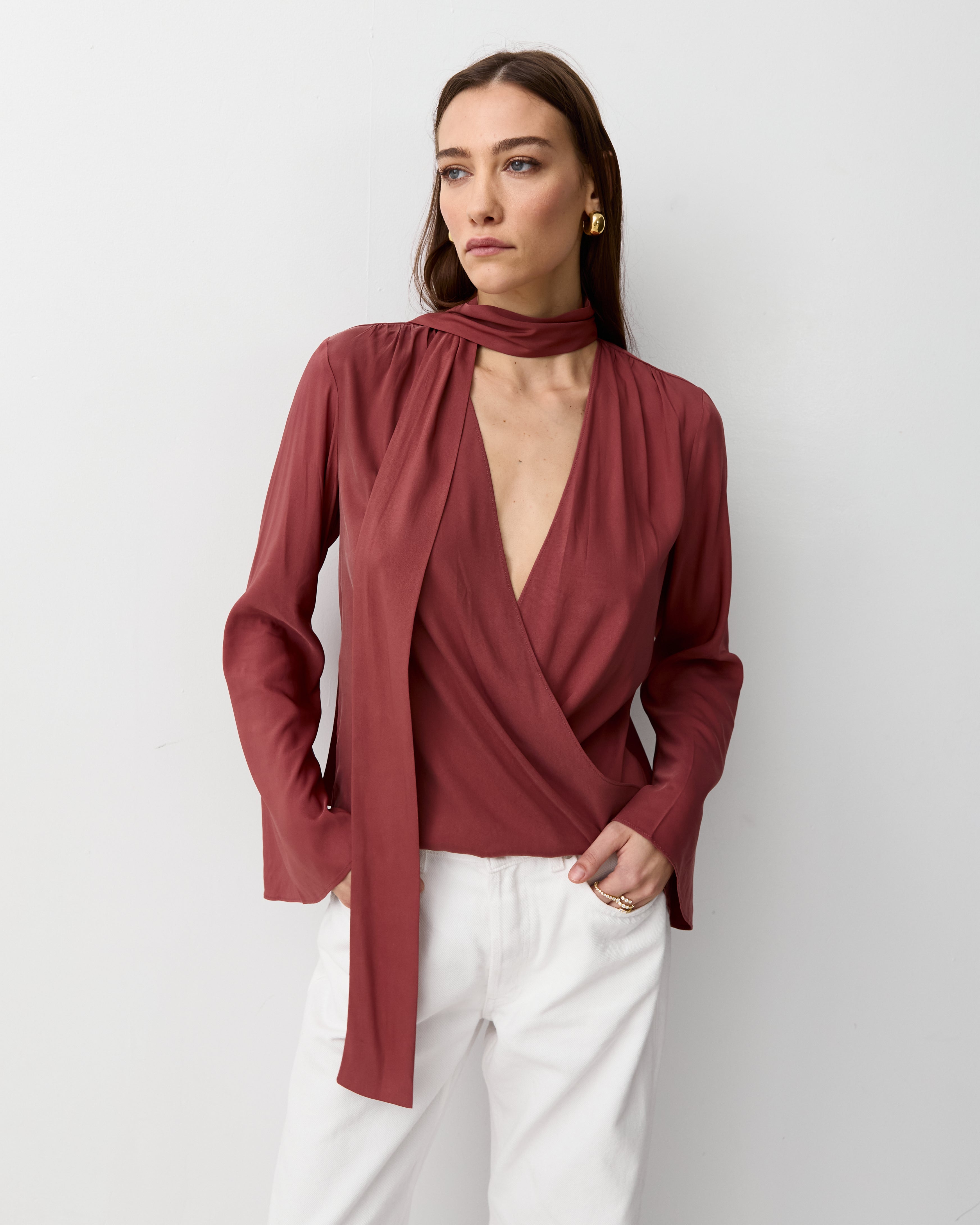 The Blouse with scarf is a reinterpretation of sophisticated informality. It has a relaxed, fluid silhouette simply accented by the self-tie scarf detail, inviting various styling options.