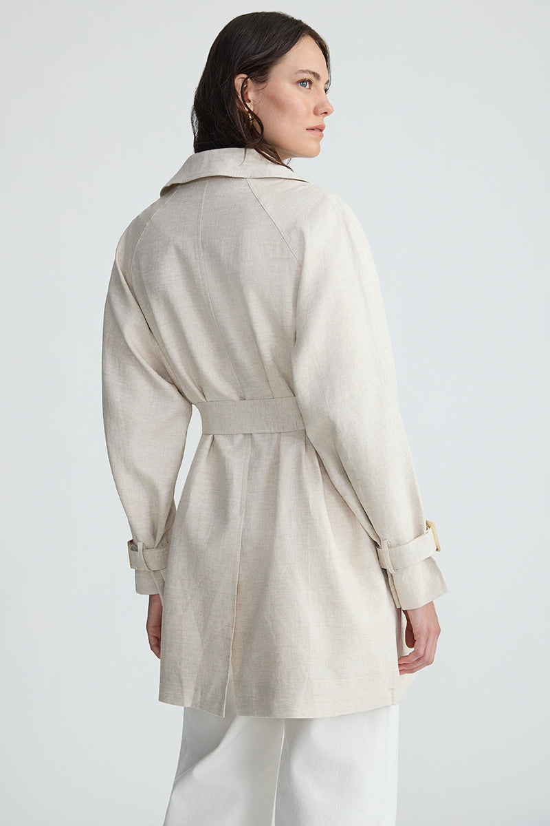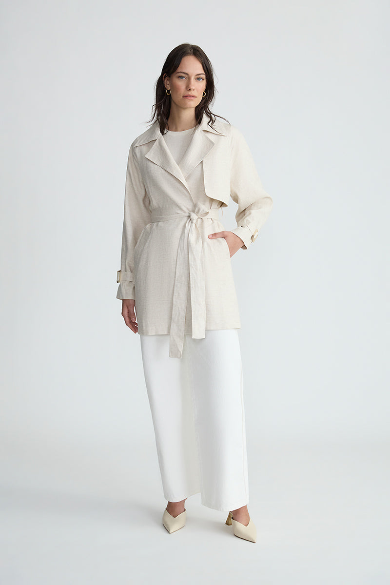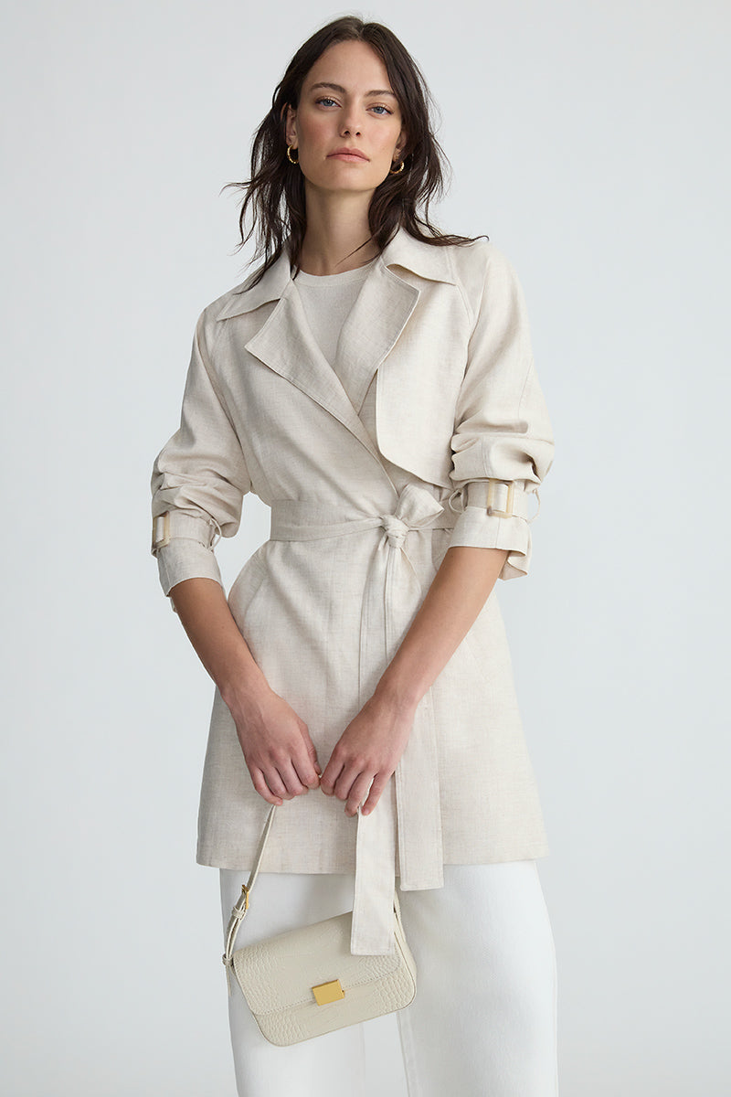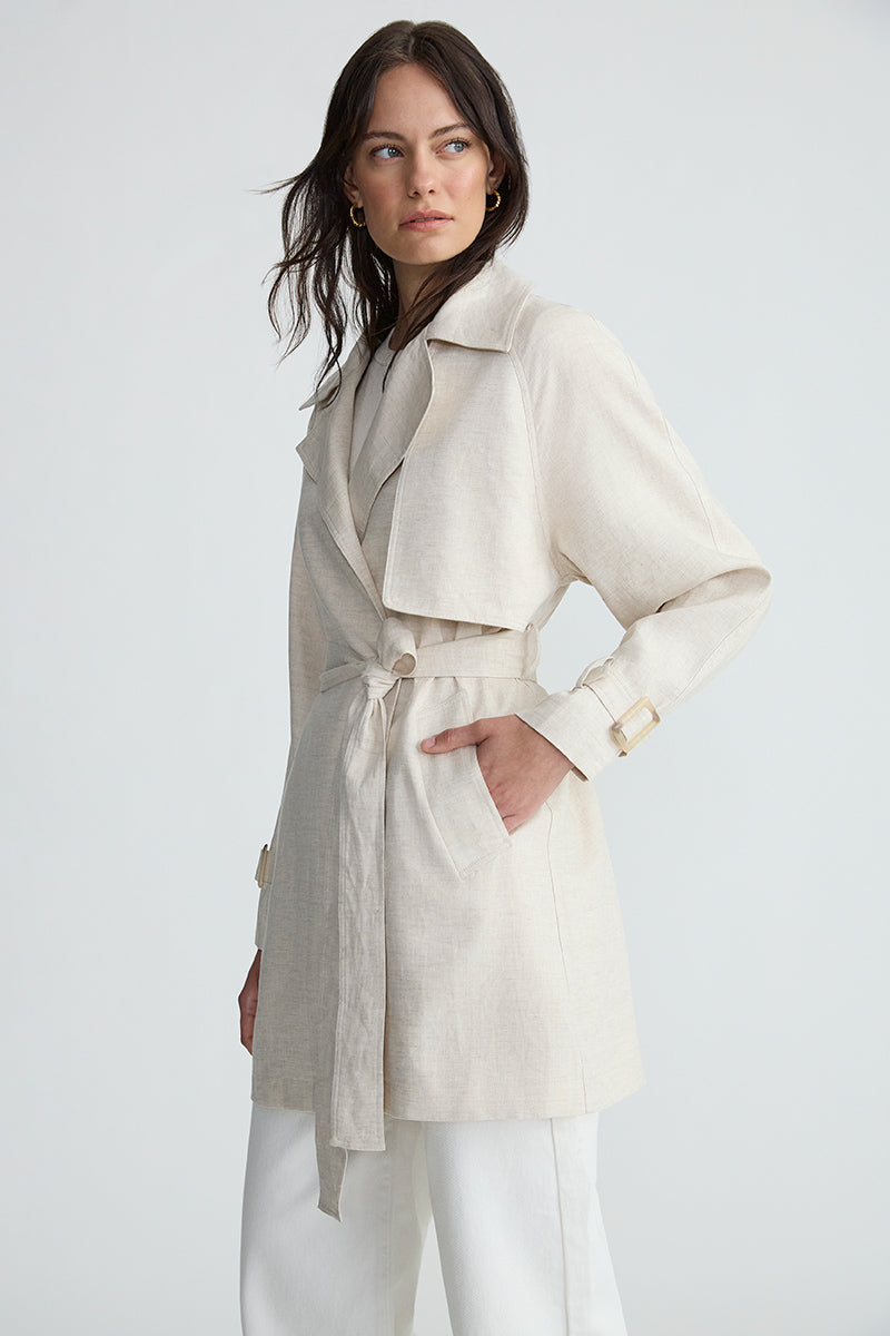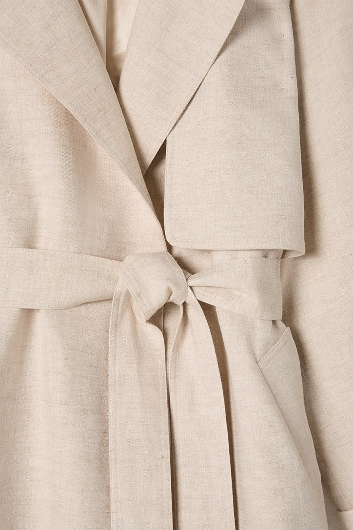 Crafted from high-quality linen and fully lined with cupro, our newest trench is a light wight piece cut with a slight oversized feel. Featuring complementary tortoiseshell buckles, side pockets and matching belt, making it both practical and stylish.