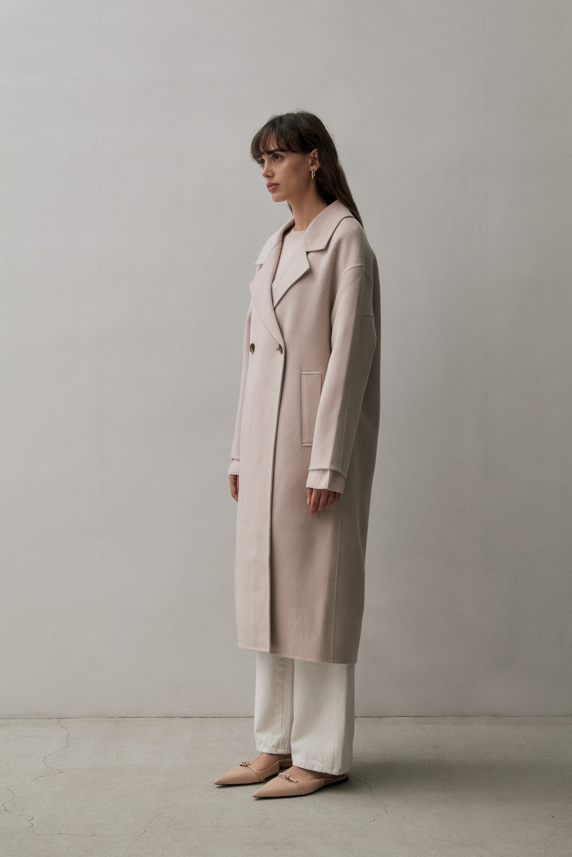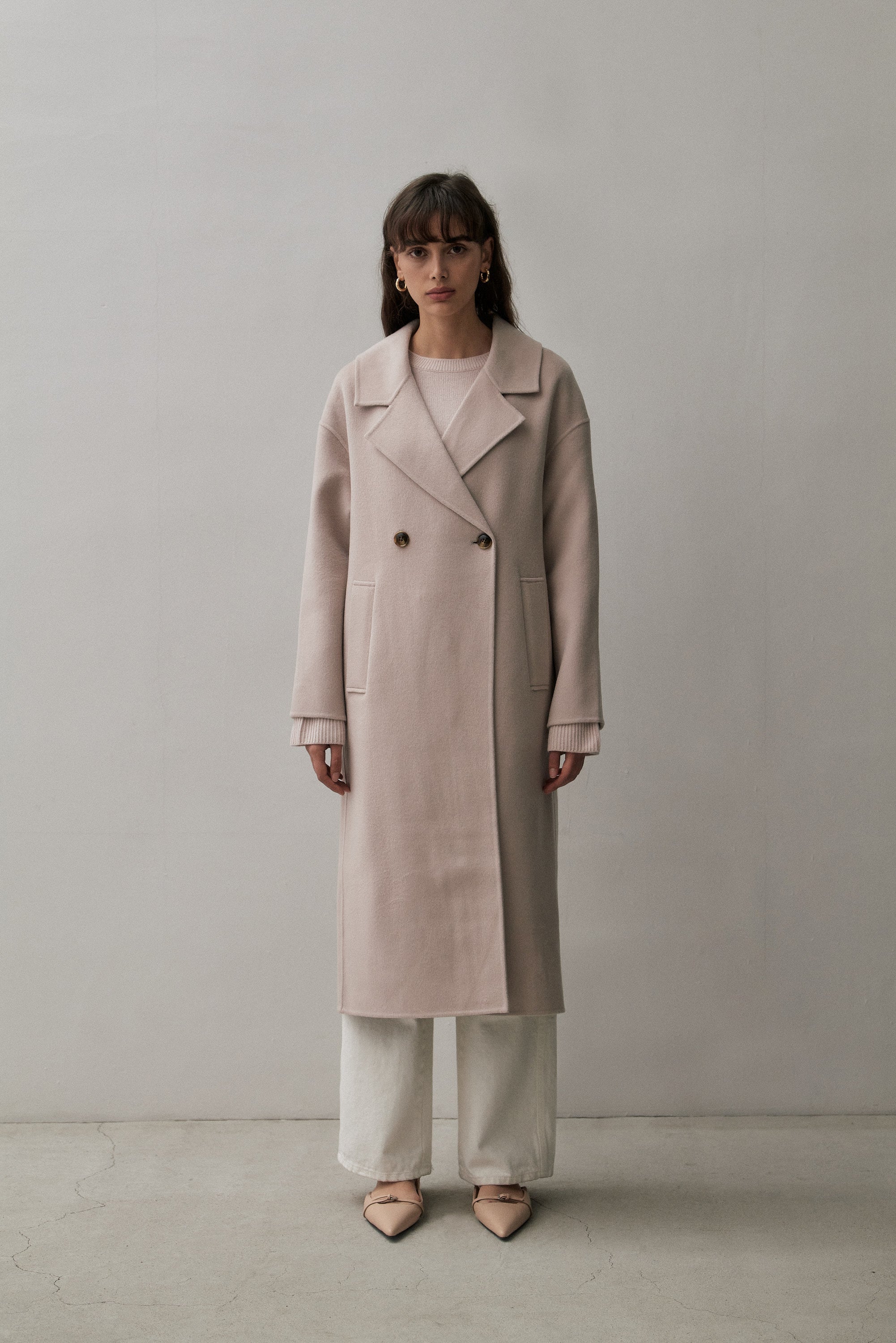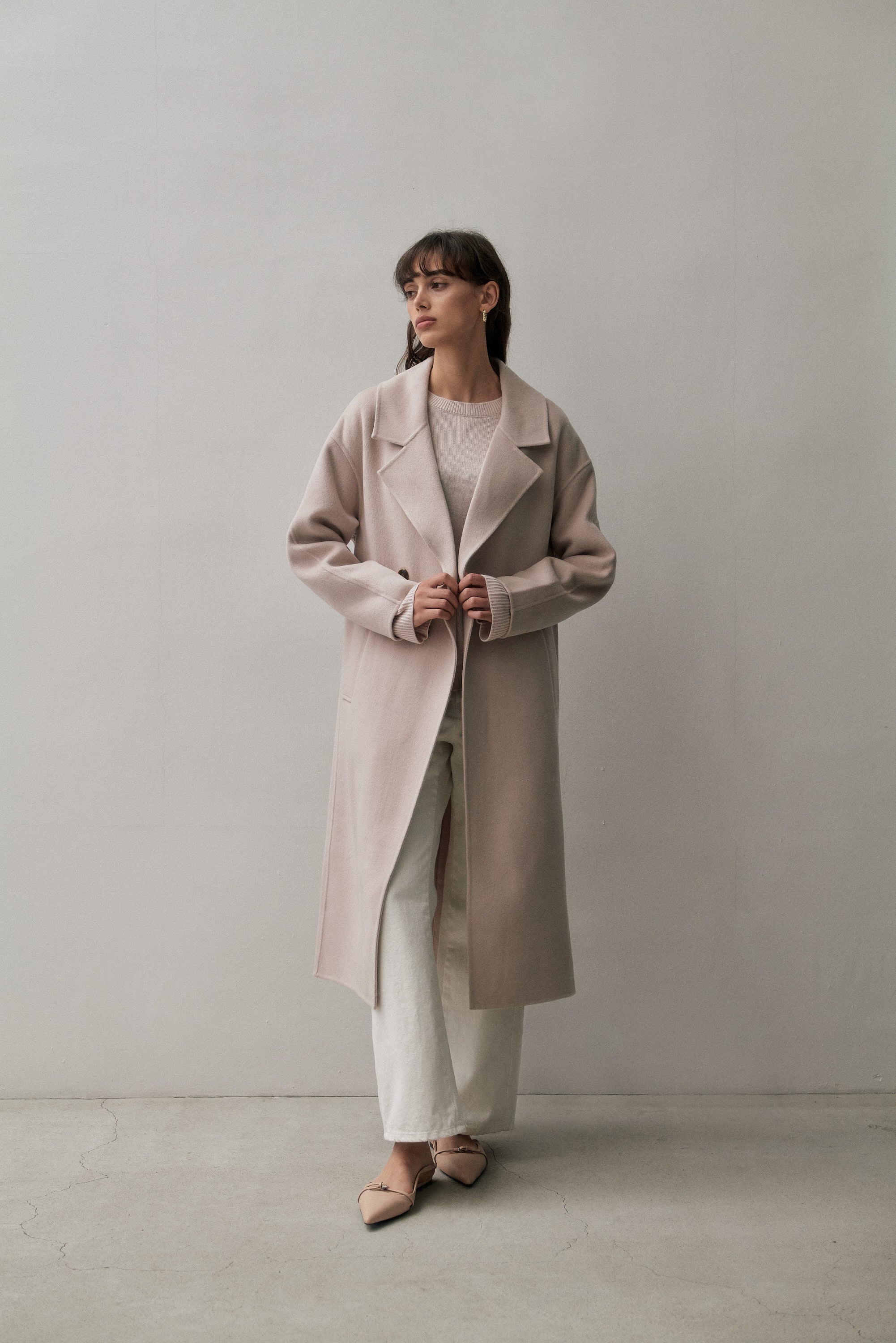 Our double faced coats are created with our signature blends of cashmere and superfine merino wool, sourced from Inner Mongolia. This cashmere is celebrated for its softness, warmth, and lightweight properties, making it an ideal choice for luxurious outerwear. Complementing the cashmere, our fine merino wool is known for its incredible softness and excellent thermal regulation, adding durability and resilience to the fabric, ensuring our coats maintain their shape and beauty over time.